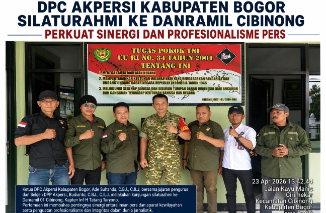 SINDITOnews.com | Bogor, — Dewan Pimpinan Cabang (DPC) Asosiasi Keluarga Pers Indonesia (Akpersi) Kabupaten Bogor melakukan kunjungan silaturahmi ke Koramil 01 Cibinong, Kodim 0621/Kabupaten Bogor, pada Kamis (23/4/2026). Kegiatan ini menjadi bagian dari upaya memperkuat sinergi antara insan pers dan aparat kewilayahan.