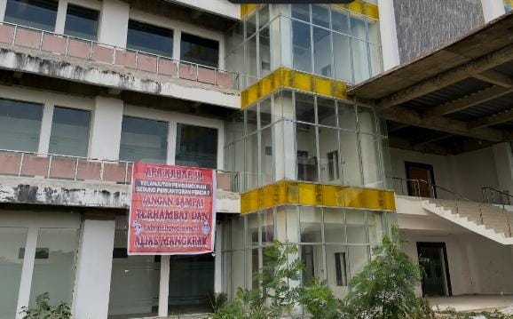 Proyek yang dimulai pada 2020 itu sedianya dibangun lima lantai dan diproyeksikan menjadi pusat pelayanan publik terpadu. Namun hingga kini hanya menyisakan kerangka bangunan berlumut, kaca pecah, dan ilalang tinggi.