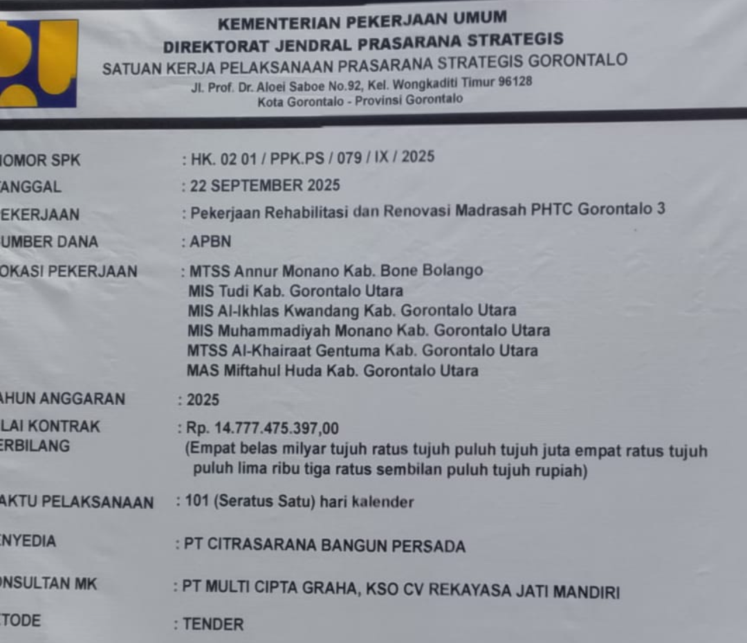 SINDITOnews.com| Gorontalo Utara — Proyek rehabilitasi dan renovasi Madrasah PHTC Gorontalo 3 yang dibiayai melalui APBN Tahun 2025 kembali menuai sorotan publik. Selain dugaan pelanggaran keselamatan kerja (K3) dan spesifikasi teknis, proyek ini juga disebut telah melewati masa kontrak pelaksanaan.